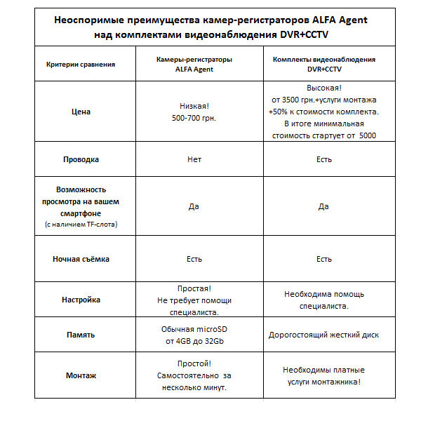 Видеокамеры Alfa Agent  примечательны тем, что содержат в себе встроенный регистратор. Благодаря данной уникальной особенности, исчезает потребность в проводке кабеля, а соответственно и в остальных услугах: монтажа/установки/обслуживания.